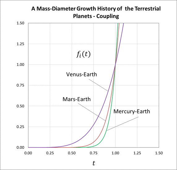 Through the surface of a cone, masses and diameters of the four planets, Mercury, Mars, Venus, and Earth, are connected in an equation that is similar to those linking the Sun and its planets. Growth of Mercury, Mars, and Venus is coupled with Earth. The three growth curves in the figure are almost identical to those for Jupiter, Neptune, and Uranus. An additional figure in the chart describes the growth end and the mass-diameter stability. The terrestrial planets are approximately 5% older than the gas giants.